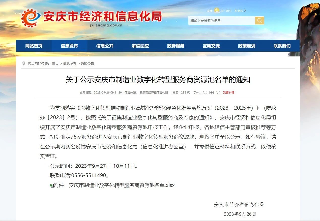 9月26日,安庆市经济和信息化局发布了《关于公示安庆市制造业数字化转型服务商资源池名单的通知》,安徽熊猫体育继入选安徽省制造业数字化转型服务商、芜湖市数字化转型服务商后,再次入选市级数字化转型服务商。