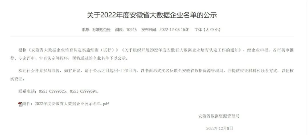 ? ? ? ?近日,?根据《安徽省大数据企业培育认定实施细则(试行)》的文件精神,经市级初审、专家评审等流程,安徽省数据资源管理局公布了《关于2022年度安徽省大数据企业名单的公示》,安徽熊猫体育成功通过评审,经认定成为2022年度安徽省大数据企业!